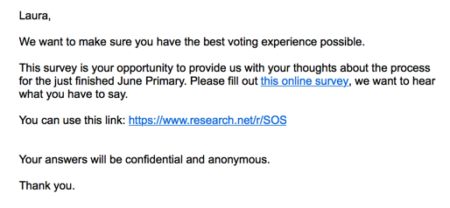 This whole email is a mess of problems, and it’s claiming to be from the California Secretary of State. It’s also discussing the June Primary, which isn’t the election we just had. The from address doesn’t reassure me, they’re claiming to be: VotersChoice.SoS.Ca.Gov@mailservices6.com. The mail is being sent to the address I gave California when I registered as an overseas voter, but those lists are public.